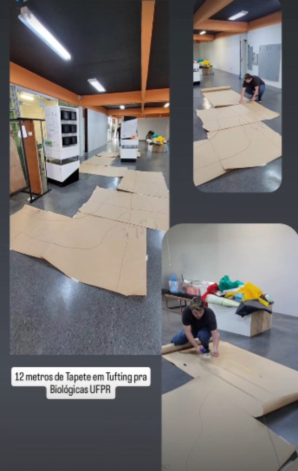 Aqui entrou o desafio logístico. Como fazer um rio sinuoso de 12 metros caber no quadro de tufting? A solução foi fatiar o projeto.