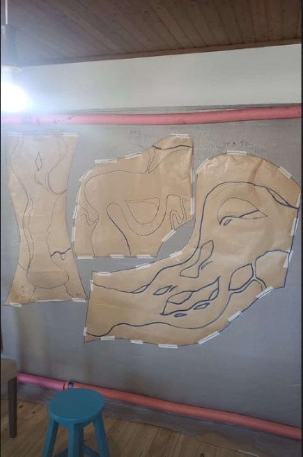 O processo começou de forma analógica e colaborativa: desenhamos com giz diretamente no chão do museu. Testamos curvas, imaginamos o fluxo dos visitantes e definimos o trajeto. Uma vez decidido, cobri o trajeto de giz com papel kraft e transferi o desenho com canetão permanente. Foi esse "mapa" gigante que levei para o ateliê.