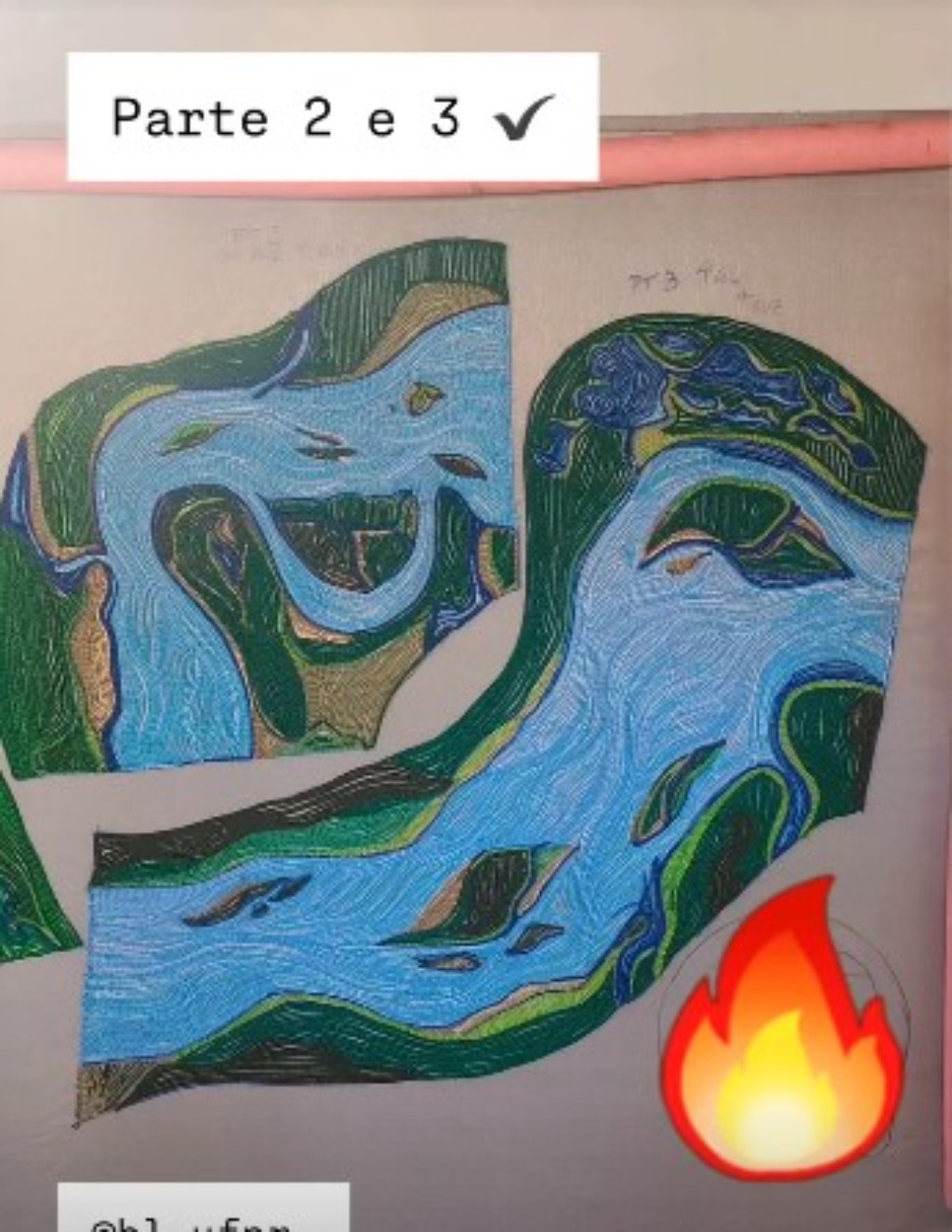 Foram 30 dias de trabalho ininterrupto. Utilizamos mais de 100 novelos de lã. Foi um processo lento, gradual e de muita paciência. Mas, ver as 11 partes se unindo e formando um corpo único de água têxtil no chão do museu fez cada segundo valer a pena.