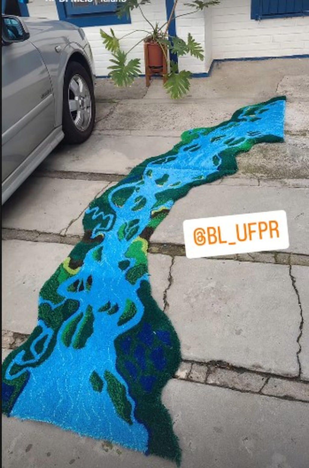 O tapete foi construído em 11 partes individuais. Essa divisão foi essencial não só para caber no bastidor, mas para conseguirmos executar as curvas acentuadas que um rio real possui.